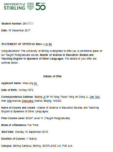 学生的第一次首访,我简单了解了一下她的背景条件,学生是在 09 年完成了自己自考的本科课程的学习,均分成绩不是特别的优异,这点在学生申请世界排名前两百院校的教育专业设置了一定的障碍。在整个的咨询过程中,学生在最初的阶段对自己是否能申请到好学校充满了疑虑和担忧,毕竟在国内工作和家庭都十分稳定的情况下下定决心出国深造是非常需要满足自己在就读院校上面的希望的。这时,我建议了学生不要只把眼光放在世界排名上面,一个适合的院校选择更需要着眼于好的专业排名。所以我推荐了世界排名不是很高但是教育学专业排名全英第四的斯特灵大学,成功帮助了学生做好了最终的决定。