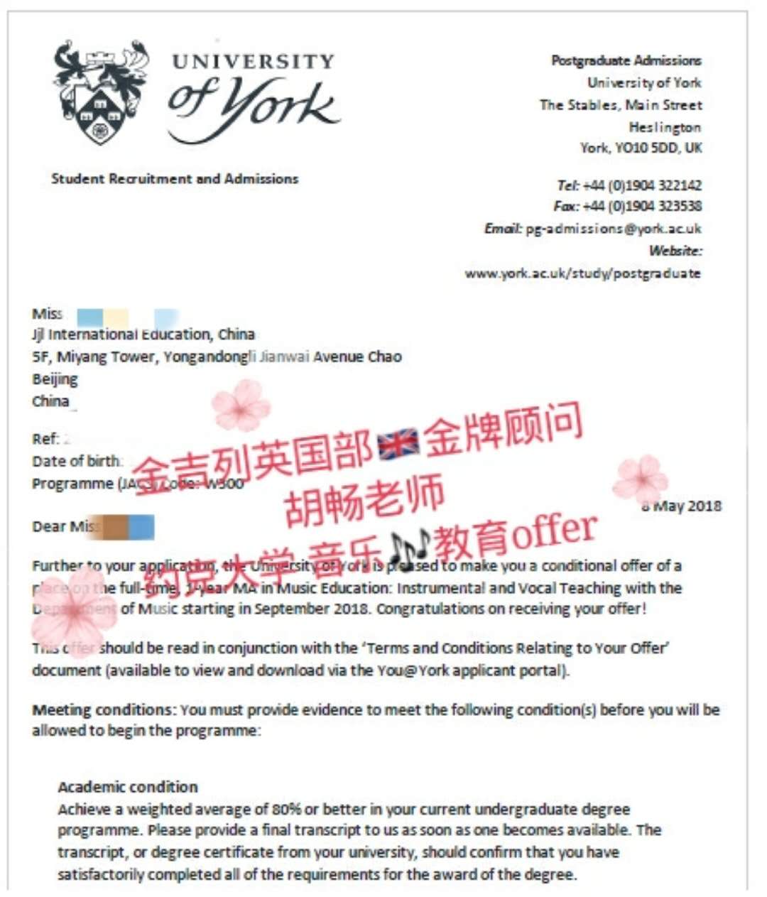 申请难点:学生申请比较晚,在没有作品集的情况下,成功帮孩子要到面试名额,成功拿到约克大学-音乐教育专业offer~