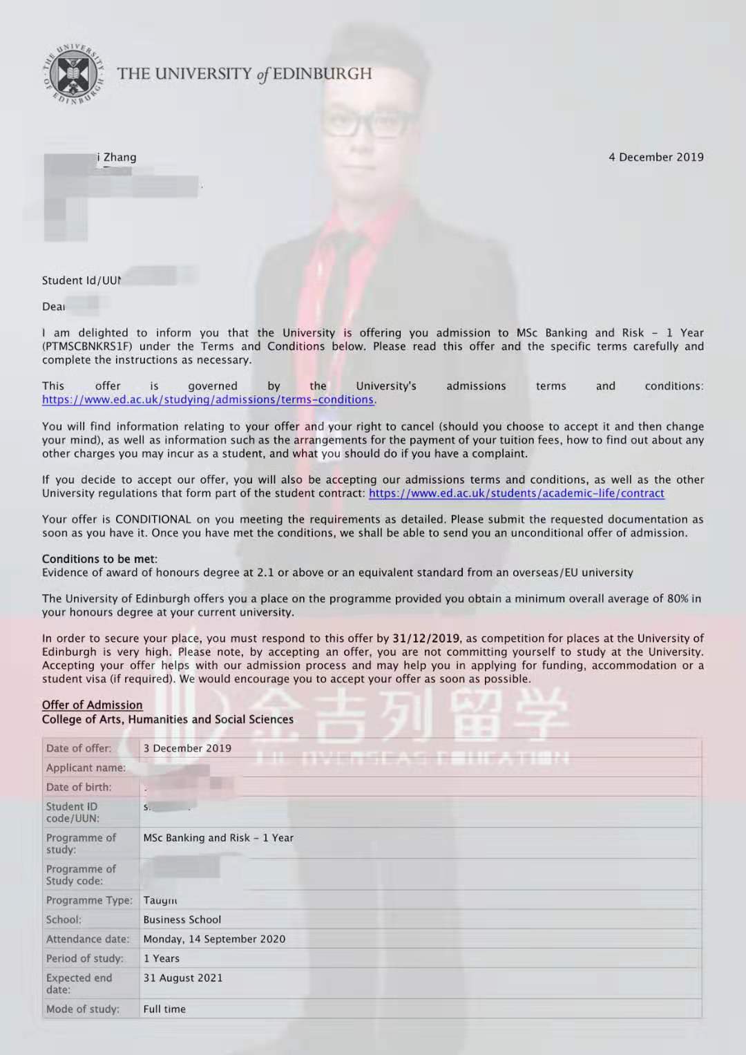 学生是大三下开始规划并选择专业,学生在校的经历丰富,并且有三段实习的经验,雅思7.0.后续也考出来了GMAT740,并且专业课的优势很大,并在文书中苦下功夫,多次修改后突出了自己的优势,也是成功的拿到了爱丁堡的首录,也期待学生能拿到UCL,KCL和IC的录取,以下是通知书分享。