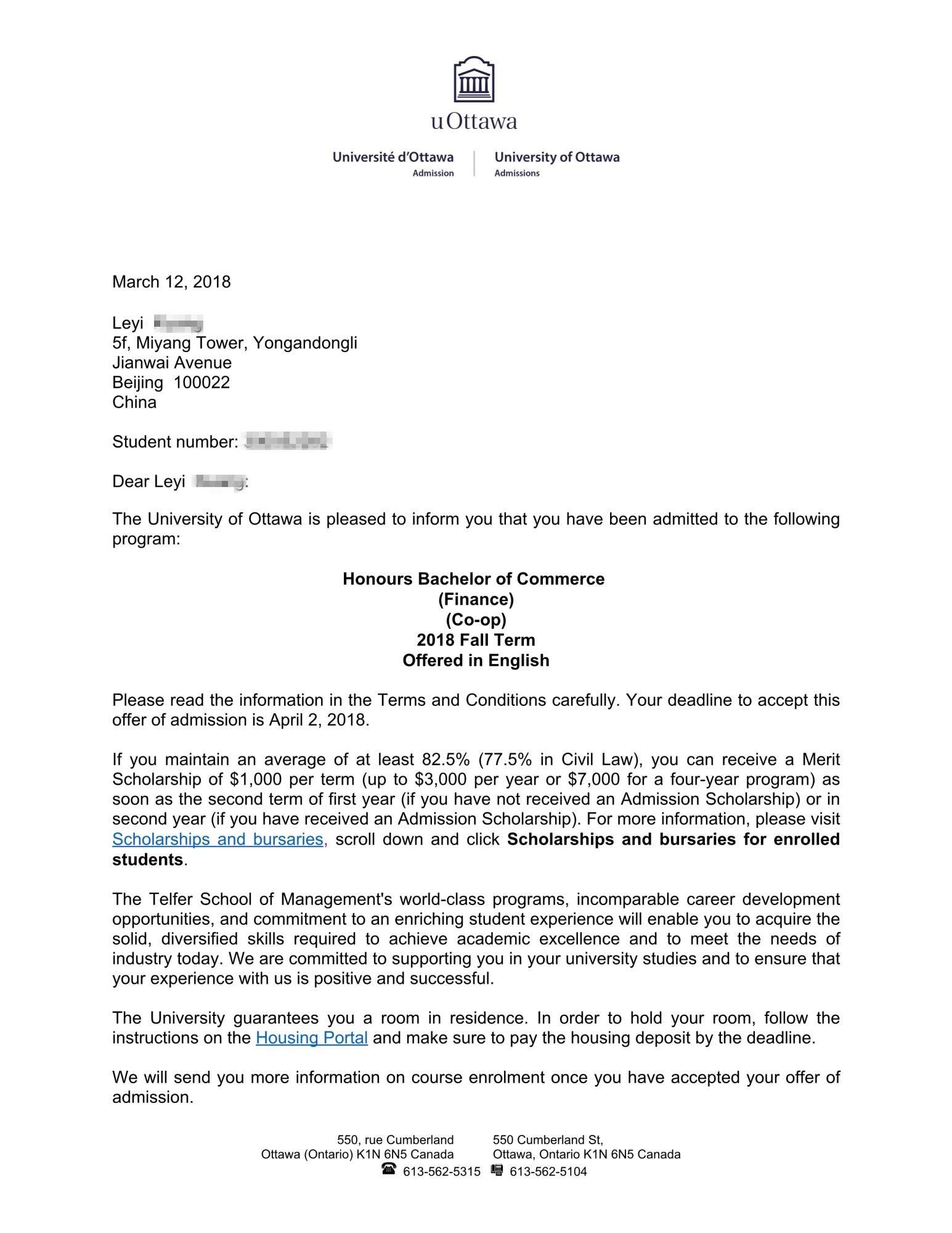 3.文书老师 积极为学生联系了资深文案经理撰写材料,并与后期 外联 老师反复与 渥太华大学 共同联系,学生最终经过筛选,终于在竞争非常激烈的情况下,拿到了 学校 的 录取 录取书 +ESL语言课。