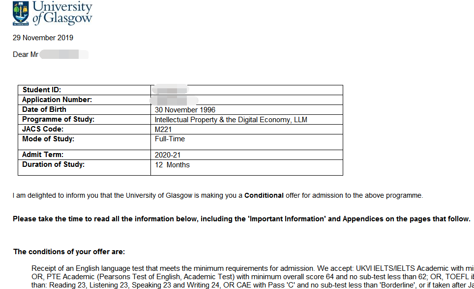 录取分析:学生是今年的9月份找我办理的,由于时间比较紧张,我们马上开展了紧张的准备工作,定校定专业,申请材料收集,文书撰写,对稿,定稿,材料指导,推荐信签字等等,终于在11月初递出了申请,不枉我们的努力,格拉斯哥大学在11月底发来了录取!