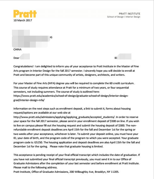 祝贺我们的S同学成功获得了全美顶级艺术院校Pratt Institute录取,我们为她感到骄傲,下面我们来分享一下S同学的申请经历。