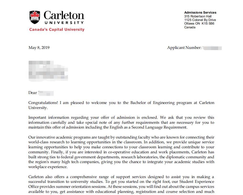 申请结果:申请了五所院校,录取三所,学生最终选择就读卡尔顿大学。