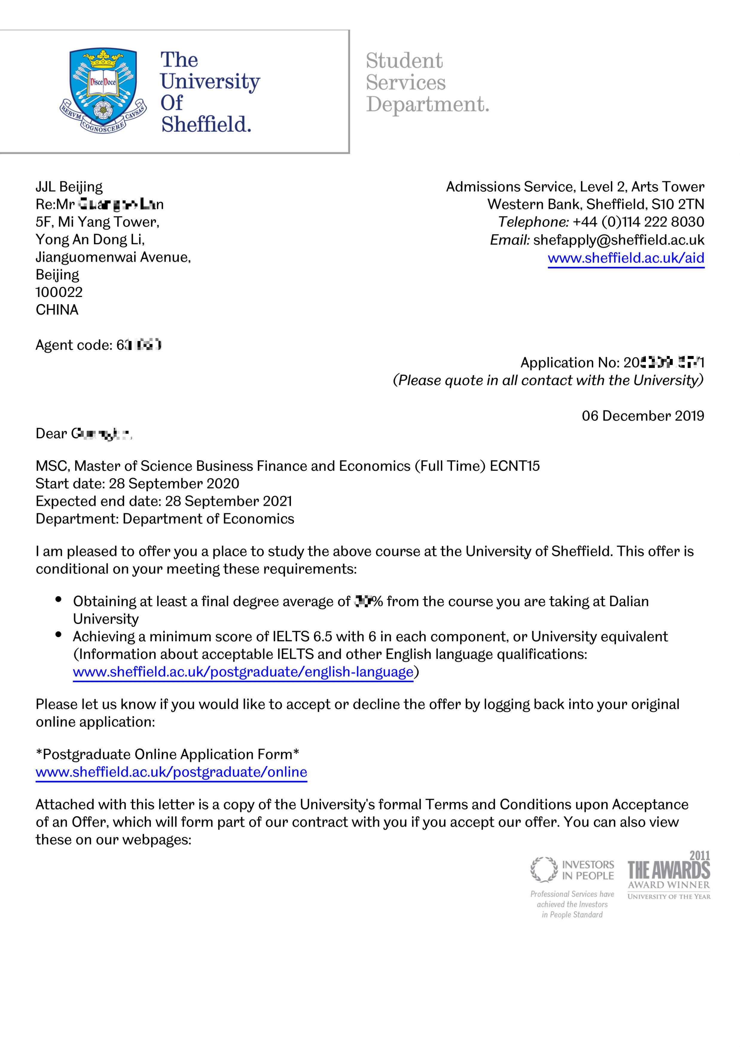 学生是属于远程签约,找到我们咨询的时候很明确表达了想要去名校的想法。我们得知学生本科背景相对一般,成绩还不错,想要申的专业又属于商科里比较热门的金融相关,所以难度非常大。我们指导学生在提升均分的同时,把雅思和GMAT考试提上日程。让我们非常开心的是,在今年谢菲竞争如此大的情况下,我们的首录就拿到了谢菲商科offer,也期待接下来其他学校的好消息。