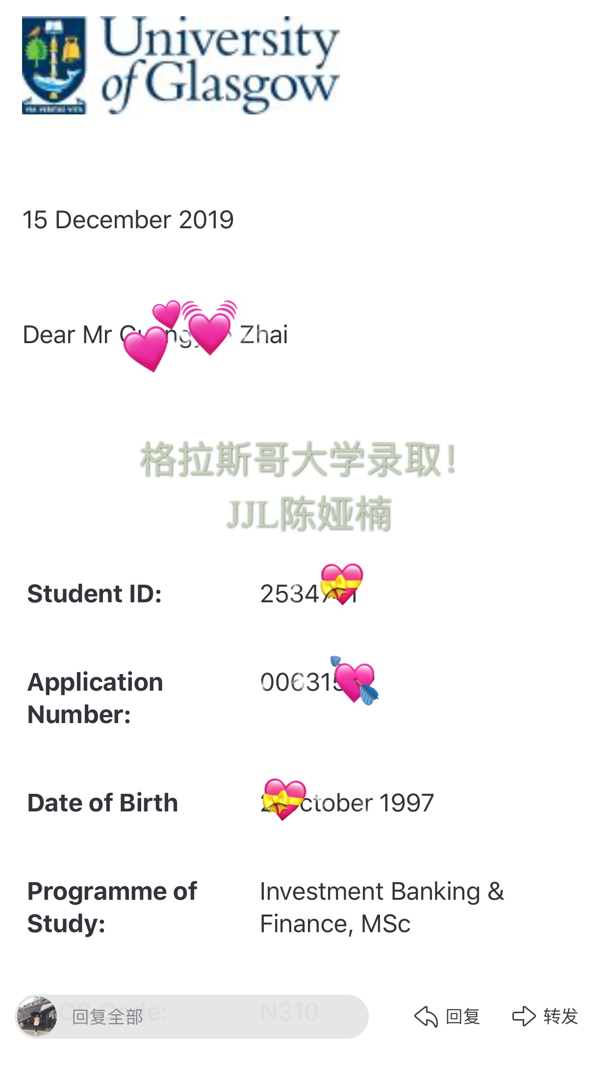 学生当时找到我的时候,已经毕业了,明显感觉到英国申请高峰期迎来,找到我抓紧开始准备申请,根据他的情况量身帮他制定了设计方案,尽快准备好材料后递交了申请,在11月收到邮件,学生的申请被放道了waiting list即等候区,因为格拉斯哥大学申请量巨大,收到了太多优秀的申请,就在12月15日捏把汗的时候,来录取了。