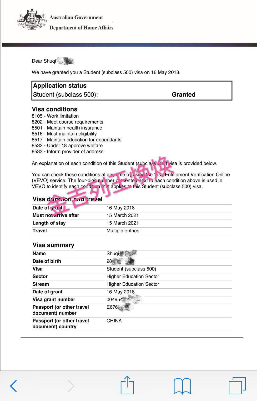 恭喜shuqi在本科毕业之前就拿到澳洲研究生的500学生签证。早做规划,在毕业之前就安排好自己的学习规划。澳洲这边是可以提前办理CON-COE的,有了CON-COE就可以办理签证了,但是需要注意的是得后期补交给学校毕业证、学位证和完整成绩单。以下是学生的准签信。