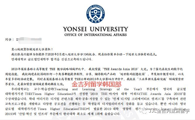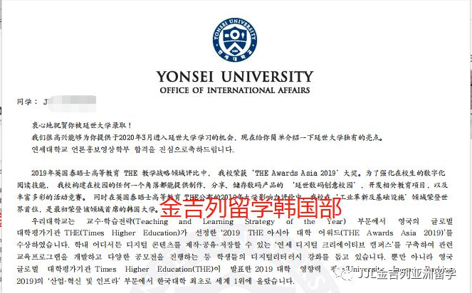 录取情况:学生普通高中毕业,无韩语英语等级,通过金吉列和延世大学的合作项目---延世直通车,成功申请到延世大学全球化人才学部的文化传媒专业。