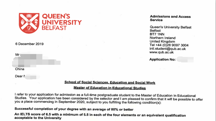 录取分析:学生在10月份的时候找我办理的,由于比较紧张,申请已经开放一个多月了,所以签约后马上就进入了紧张的准备材料的阶段,用时不到一个月的时间收集材料,制作,文书撰写,对稿,一个月内就递出了申请,于是很顺利的拿到了英国女王大学教育研究教育学硕士录取!预祝学生接下来雅思考试顺利!