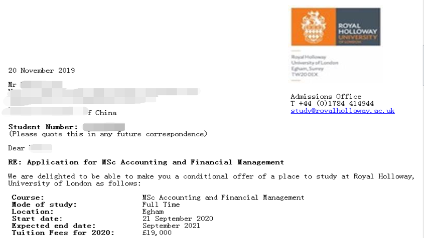 录取分析:学生在10月份的时候找我办理的,由于比较紧张,申请已经开放一个多月了,所以签约后马上就进入了紧张的准备材料的阶段,用时不到一个月的时间收集材料,制作,文书撰写,对稿,一个月内就递出了申请,于是很顺利的拿到了伦敦大学皇家霍洛威学院会计与财务管理专业的录取!预祝学生接下来雅思考试顺利!