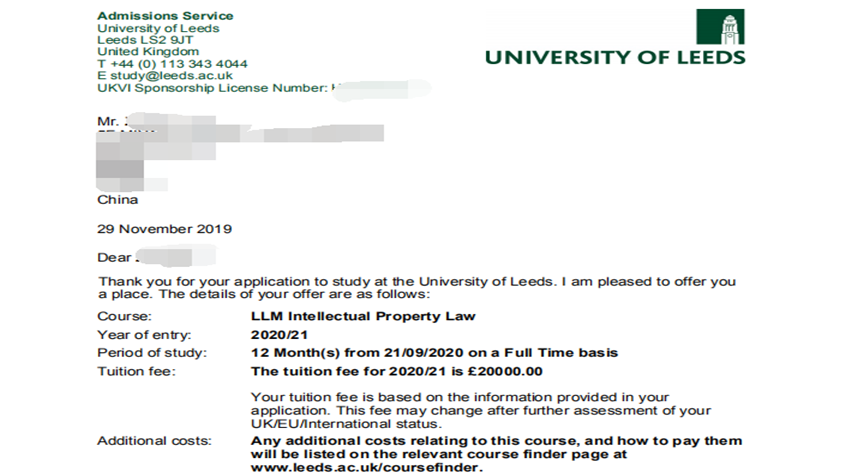 录取分析:学生是今年的9月份找我办理的,由于时间比较紧张,我们马上开展了紧张的准备工作,定校定专业,申请材料收集,文书撰写,对稿,定稿,材料指导,推荐信签字等等,终于在11月初递出了申请,不枉我们的努力,利兹大学在12月初发来了录取!