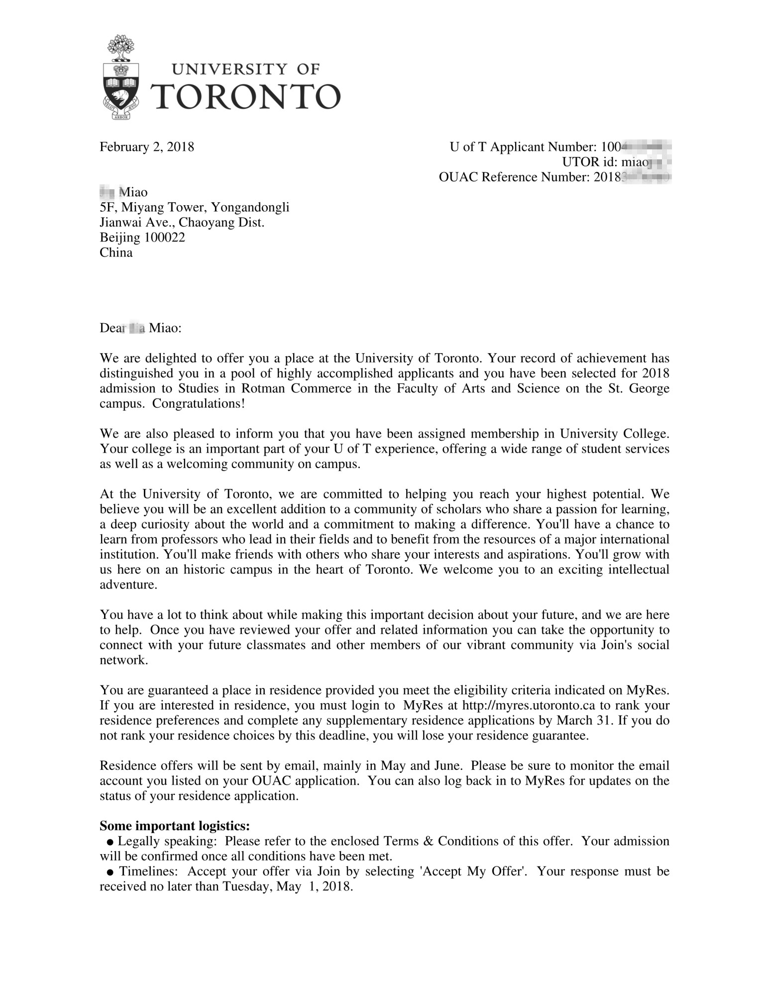 通过跟她细致的沟通后,我们了解到,虽然学生的 GPA不是特别优秀,但是学生的语言成绩和丰富的工作经验是不容忽视的,而且学生本身的亮点很多。我们建议他尝试申请多伦多大学,另外还加申请了约克大学的商科,西安大略大学的商科 。 她说不想给自己留下任何遗憾,所以通过跟她细致的沟通后,觉得自己也很想尝试一下名校商学院的申请,即使最后失败也不后悔。之所以接受他的要求,其实很大一方面我们觉得学生是非常优秀的,我们也希望尽我们最大努力满足学生的要求。