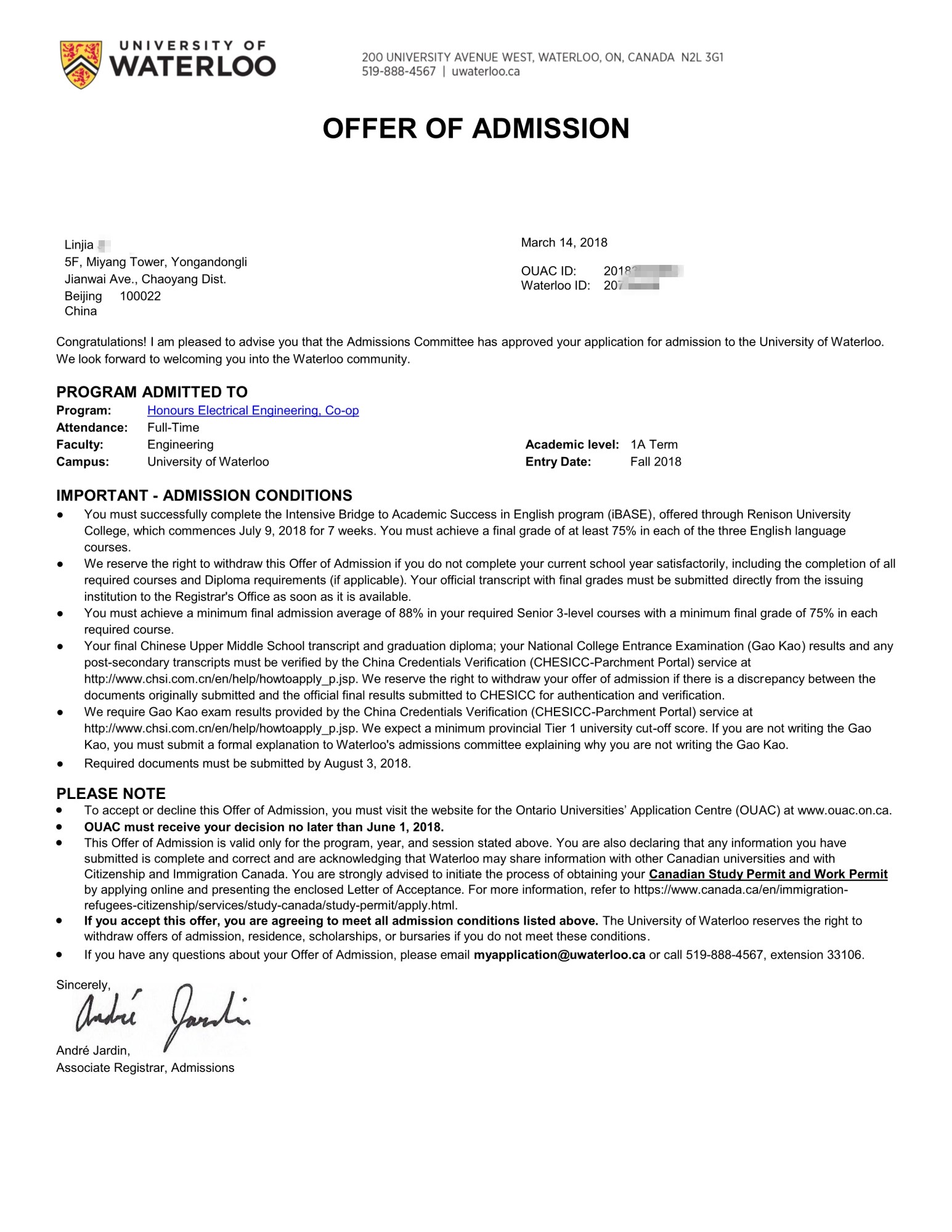 录取院校:滑铁卢大学 (带薪实习专业)、多伦多大学、麦吉尔大学