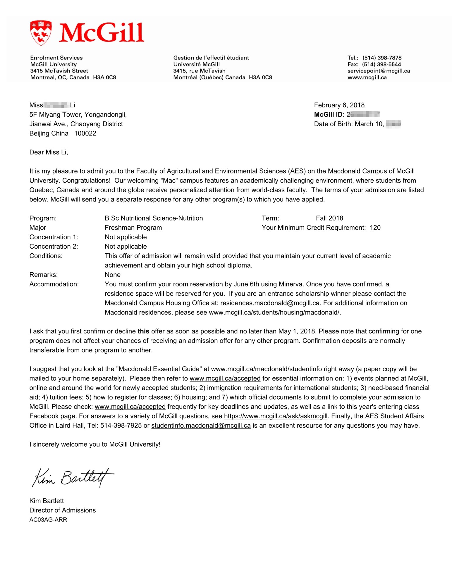 4.李同学是高三在读 ,因为提前准备申请事宜,选择麦吉尔给的是9月份的录取通知书,也就是说孩子在国内毕业以后可以衔接9月份的正课学习。不会浪费孩子的任何时间。如果家长在孩子高中毕业以后在着手申请加拿大的学校,那么很有可能会将开学月份拖延到第二年。加拿大的学校申请都是基本需要提前一年准备的,也就是说高二会考完毕以后就要开始准备申请了(特别是直录的名校,因为名额很少 竞争又很激烈)正如李同学拿到的录取通知书,只需要在后期将国内的毕业证及高三下半期成绩补交到麦吉尔就可以了。