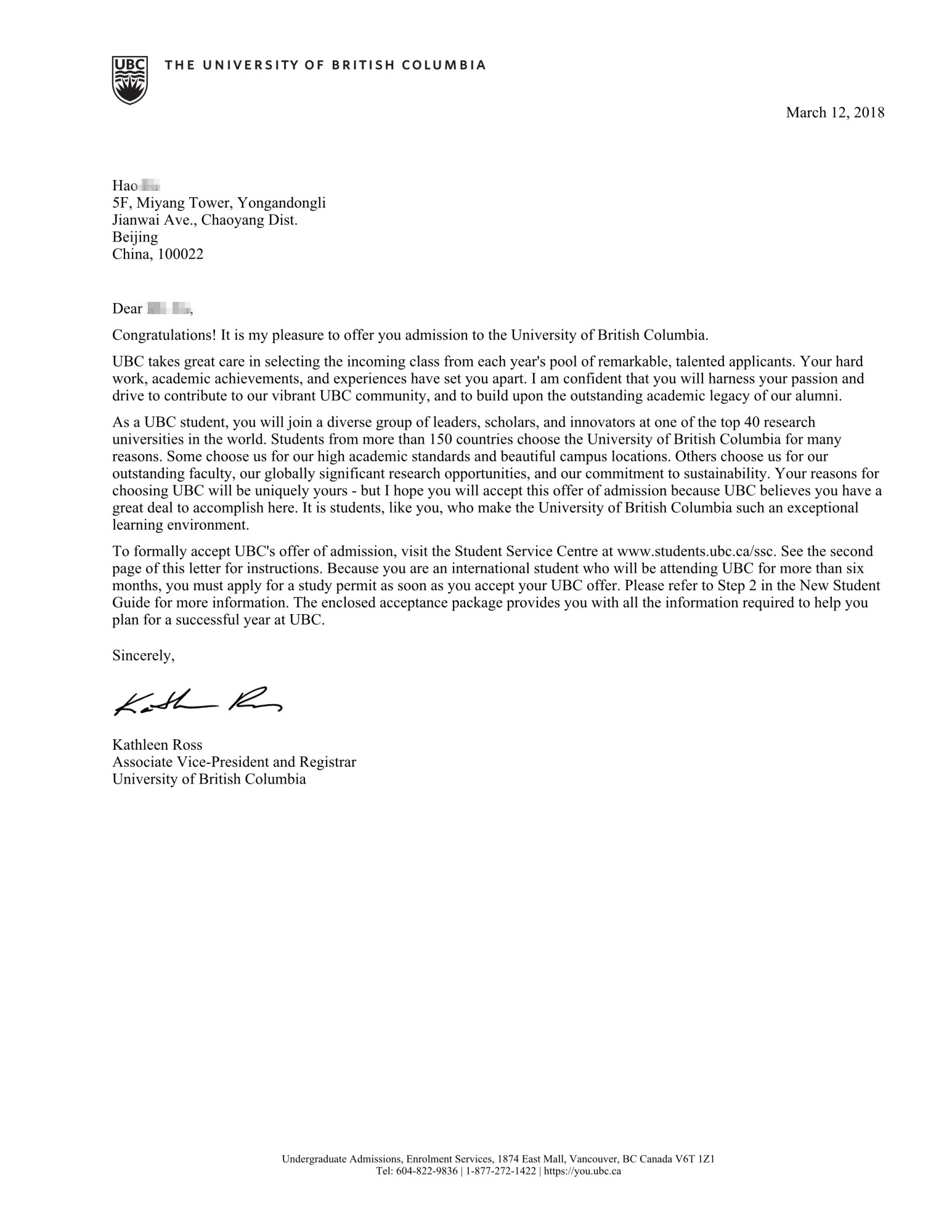 4.而多大和UBC商科有关于录制视频和写essay的要求,文书老师为学生详细讲解了注意事项,往常年题目,今年已出现的题目并让学生进行模拟。由于学生没有会考和高考成绩,只好用 SAT1和SAT2来代替。由于大部分学校在系统里统一将学习中国课程的学生划分到有会考高考这一范围以内,一些学校的状态持续没有更新。为了让学校更快的审核材料,更新状态,我们外联老师不厌其烦的给学校发送邮件,沟通材料,说明情况,终于让所有的学校都在最早的时间内更新了状态。经过一系列的努力,学生被UBC的文学学士(Bachelor of Arts)录取。