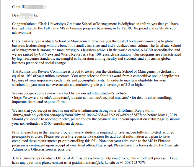 标化成绩不够争取到金融硕士直录--克拉克大学金融硕士录取