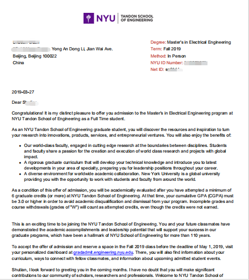 学生递交时TOEFL只有84,刚刚够学校的最低标准,为了能冲刺一下名校,和文案老师一直鼓励学生再试一下TOEFL,最终拿到了94分的成绩,也成功争取到了纽约大学录取。