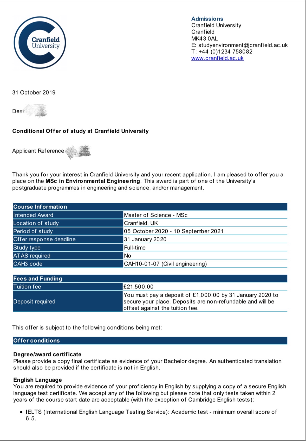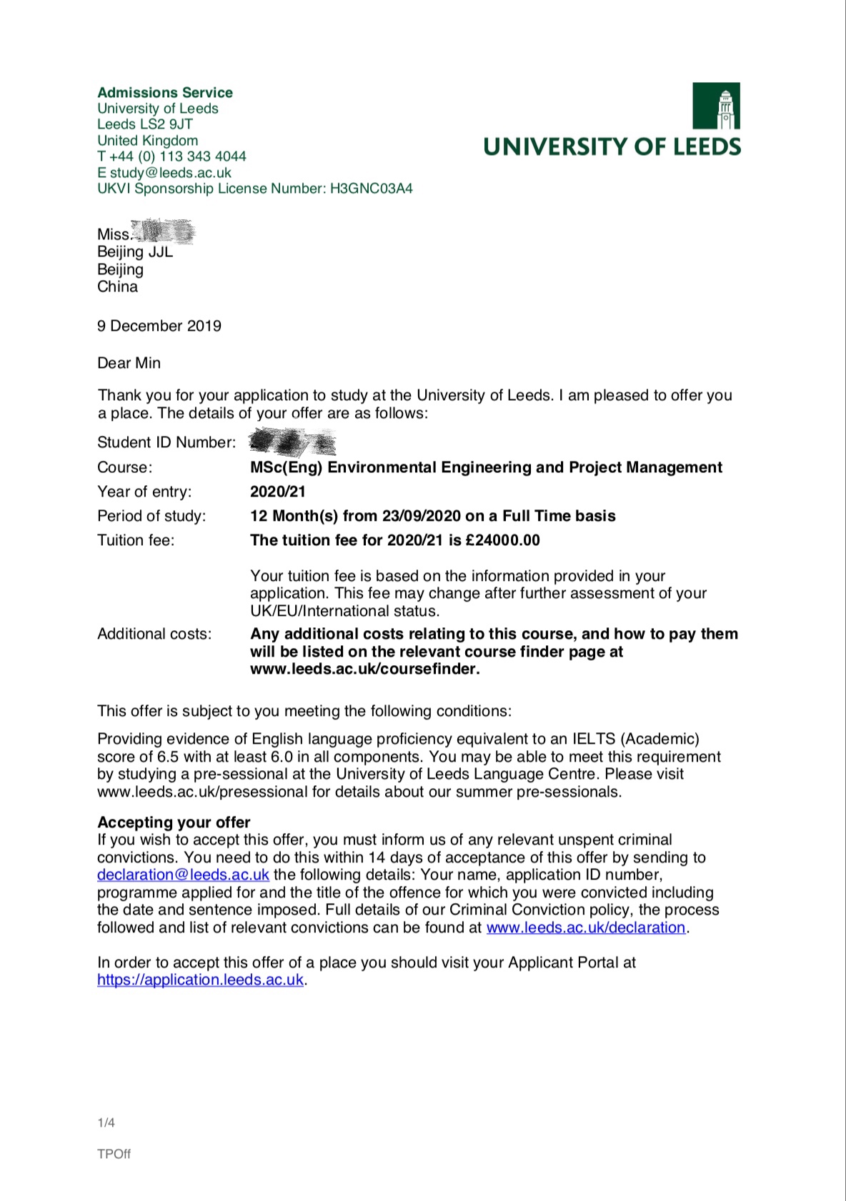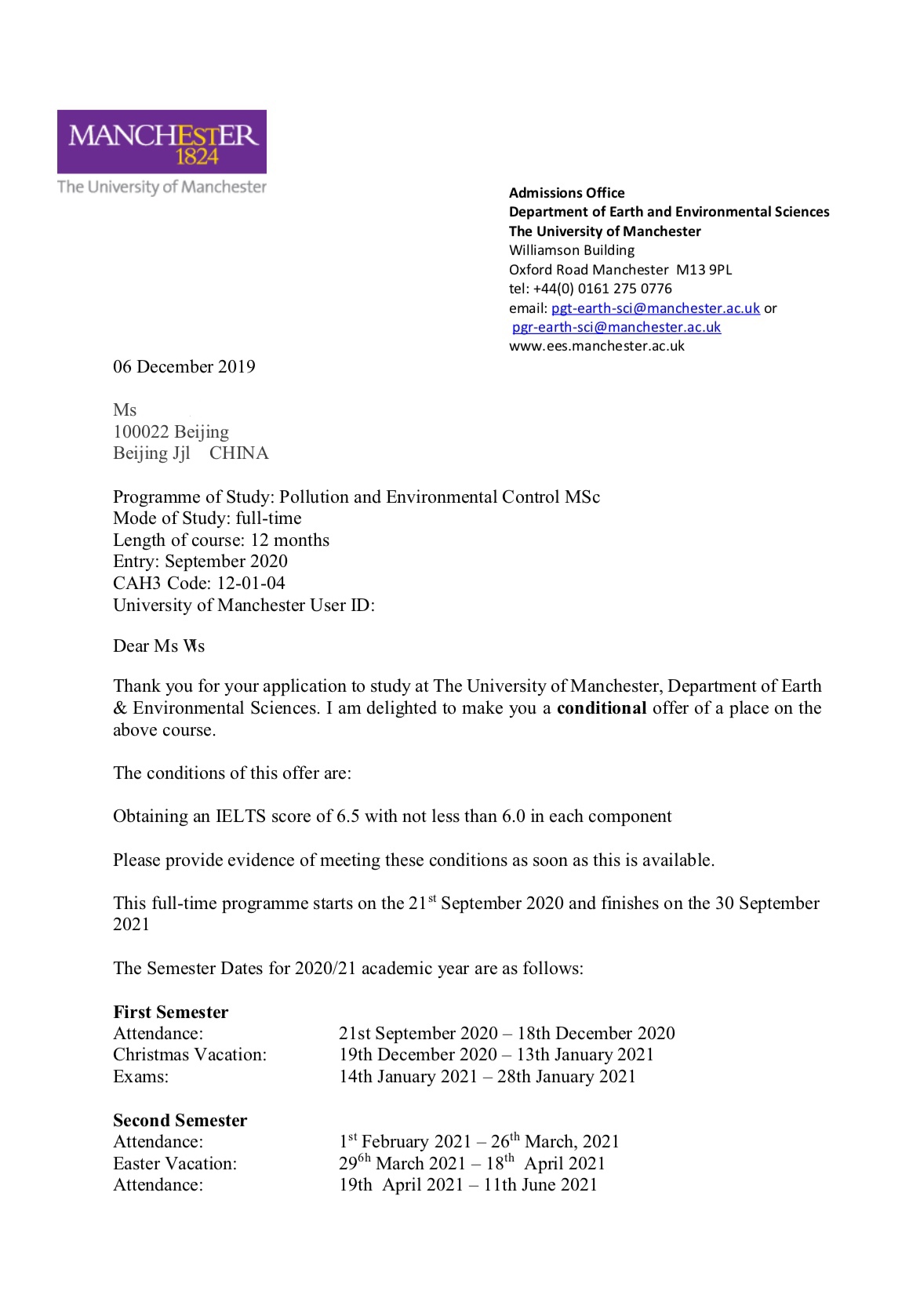 吴同学在大三下半年做的英国申请,由于学生学的是环境工程专业,想申请排名和专业度都比较高的学校,经过和学生家长沟通,最后把学校确定到综合QS排名比较高的曼彻斯特大学、利兹大学,从专业度考虑选择了一个专业性强的克莱菲尔德大学,最终我们确定了学校和专业开始准备递交申请。