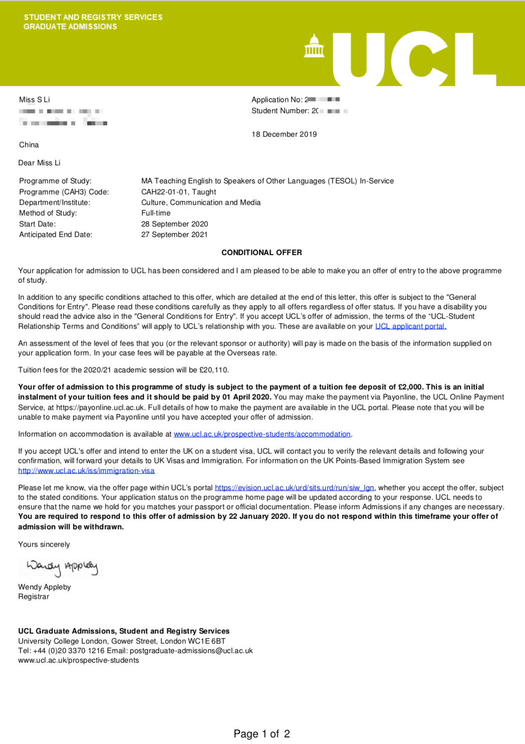 我们是在 10 月 30 号提交的申请, 11 月 6 号学生转来网推邮件,文案老师积极快速完成,在耐心等待的 6 周时间内,学生和我们都非常的紧张,考虑到今年英国申请的人暴增, G5 大学更是比往年申请人数增加,导致一些背景不错的学生也会惨遭拒绝。而其爱人在我们的提前规划下已经率先在 11 月 25 日斩获了英国伦敦玛丽女王学院的商科录取,顺利实现跨专业录取,学生更是担心自己的高难度的 G5 大学的审理情况,在过程中我们积极的宽慰学生也鼓励学生先耐心准备雅思考试,终于在 12 月 19 号我们 UCL 的外联老师传来了告知我们学生被录取的好消息!