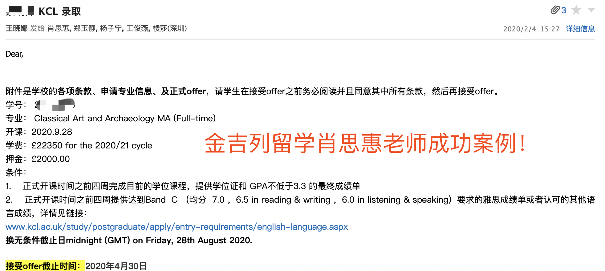 我的这位学生之前是拿到了布里斯托大学的录取,这次又收到了kcl大学的录取,真的是非常感谢我们金吉列的团队,完美的拿到了这两个录取。 学生是在2019年12月份和我签约的,大四上学期结束,时间非常的紧张。 当时 签约时就根据学生的情况迅速的把学生可以匹配的学校和专业框定了,和家长和学生很快的确定申请的学校和专业。学生也是非常的配合我们的申请团队,感谢金吉列的文案老师和外联跟进老师,在节假日前完成申请,申请后四周内拿到 布大和kcl 的offer!
