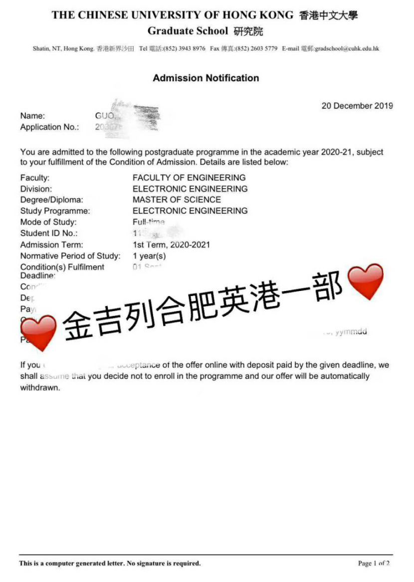 中国香港院校相工科专业实力之强,我们有目共睹的。由于申请的人数太多,英国的工科专业要求愈发严格,对于学生的硬性条件及软实力要求越来越高。该学生的优势就是 211 背景院校、均分 84、雅思6.5,但在校期间实践活动较少,软性条件欠缺。了解到该学生的情况以后,我们把重点放在学生的文书上上, ps 中详细说明了学生一直以来对工科行业的热爱以及为去留学做的准备包括未来明确的职业规划。经过与文案老师的共同努力,该学生最终拿到了世界顶尖学府香港大学,香港科技大学以及香港中文大学的 offer 。