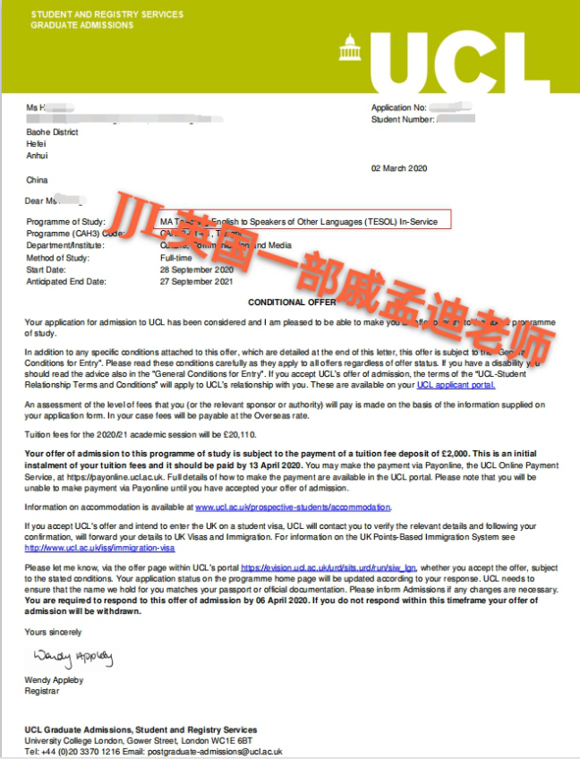 学生本身是英语专业毕业,而且英语教龄时间比较久,所以详细了解了工作背景,并且工作相关的经验与获奖经历。由于本科的背景不是特别好,所以在申请的时候文书方面加以润色了工作相关的经历,选校的时候在专业方面去筛选对工作经验有要求的,比如拿到的G5之一UCL的专业就是需要工作经验的。