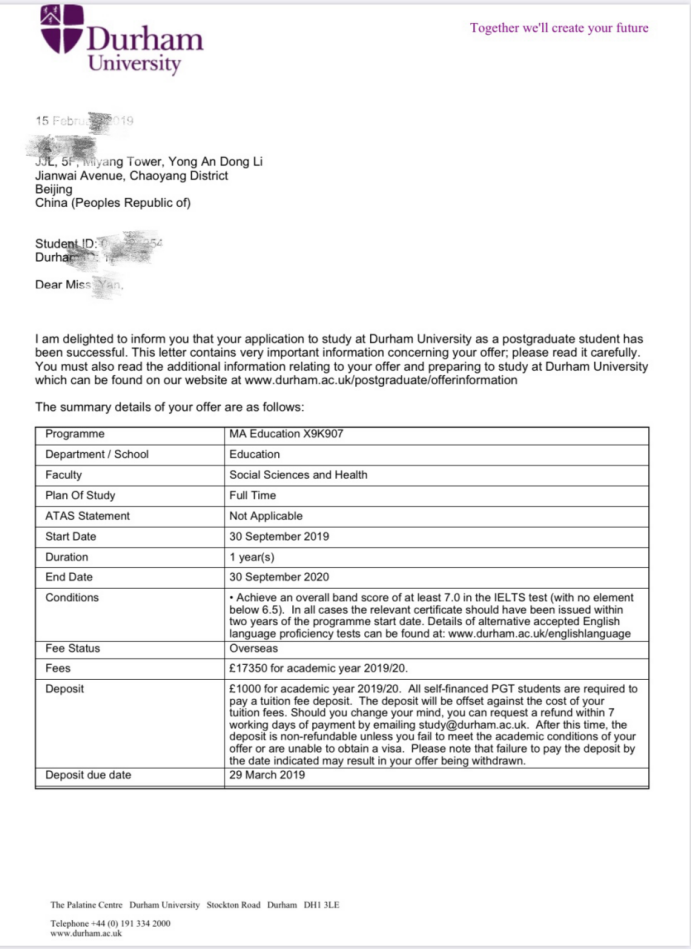 Y同学,是一位湖南邮电大学自考本科,均分78,无雅思和GMAT,有多年工作经验的女性。因为自己的学历影响到工作上的晋升,所以考虑去英国提升一下学术背景。在我们的帮助下,成功申请到QS世界大学排名78位的杜伦大学教育学专业。
