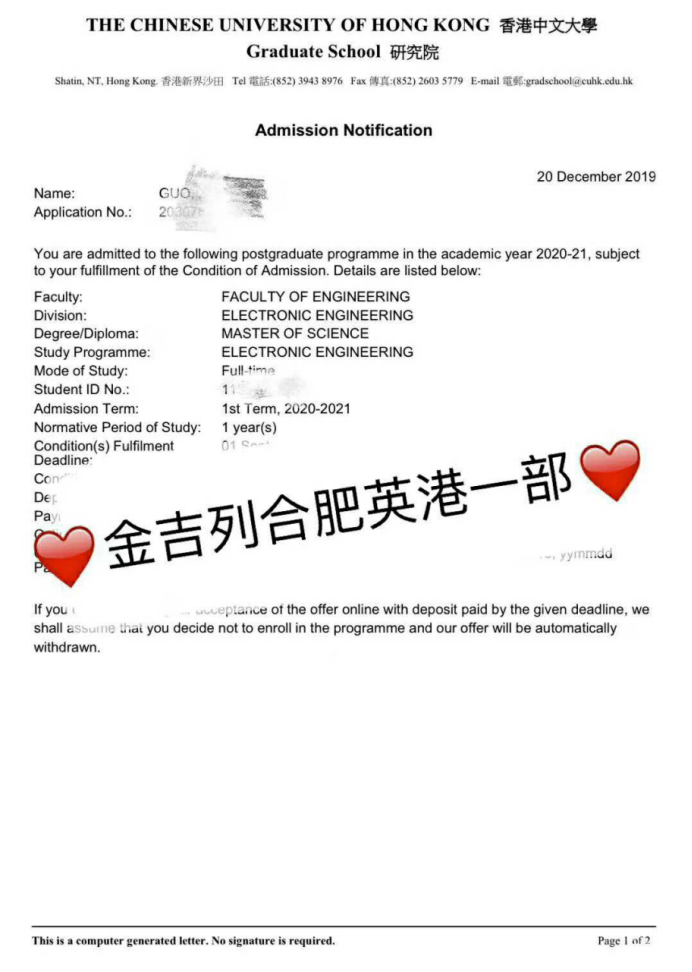 中国香港院校相工科专业实力之强,我们有目共睹的。由于申请的人数太多,英国的工科专业要求愈发严格,对于学生的硬性条件及软实力要求越来越高。该学生的优势就是 211 背景院校、均分 84、雅思6.5,但在校期间实践活动较少,软性条件欠缺。了解到该学生的情况以后,我们把重点放在学生的文书上上, PS 中详细说明了学生一直以来对工科行业的热爱以及为去留学做的准备包括未来明确的职业规划。经过与文案老师的共同努力,该学生最终拿到了世界顶尖学府香港大学,香港科技大学以及香港中文大学的 offer 。