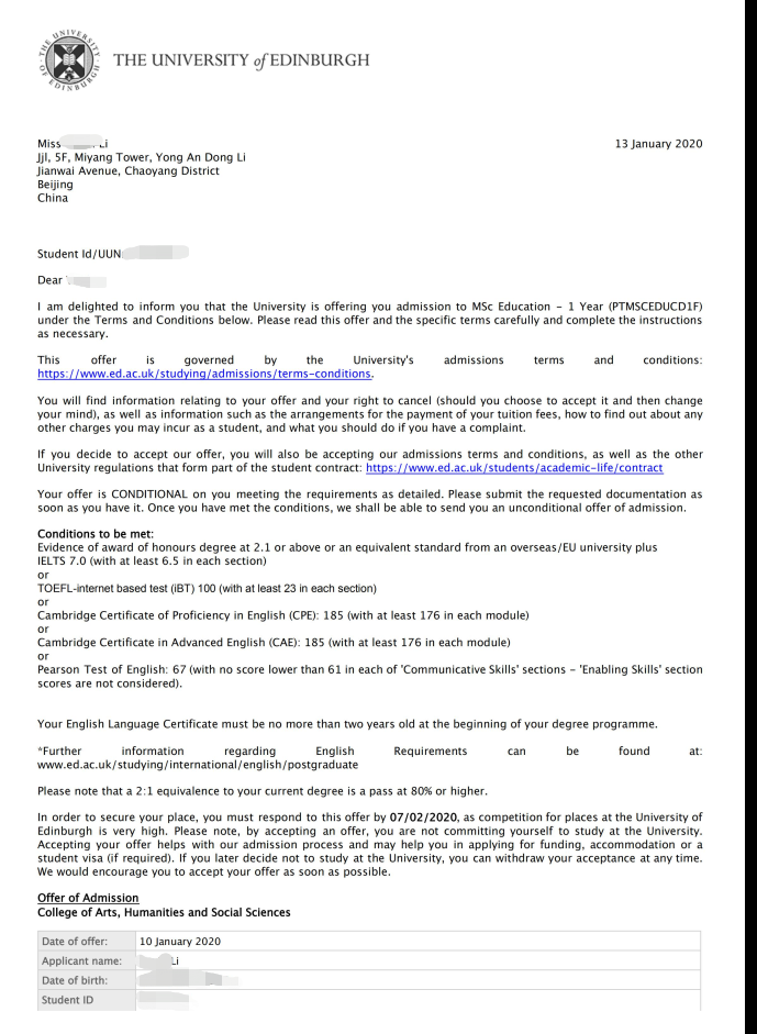 学生个人背景:目前在双非院校读大四,汉语言文学专业,均分85,在咨询老师之后,综合之前的申请案例和学生的未来职业发展方向,选定爱丁堡大学的教育学专业。