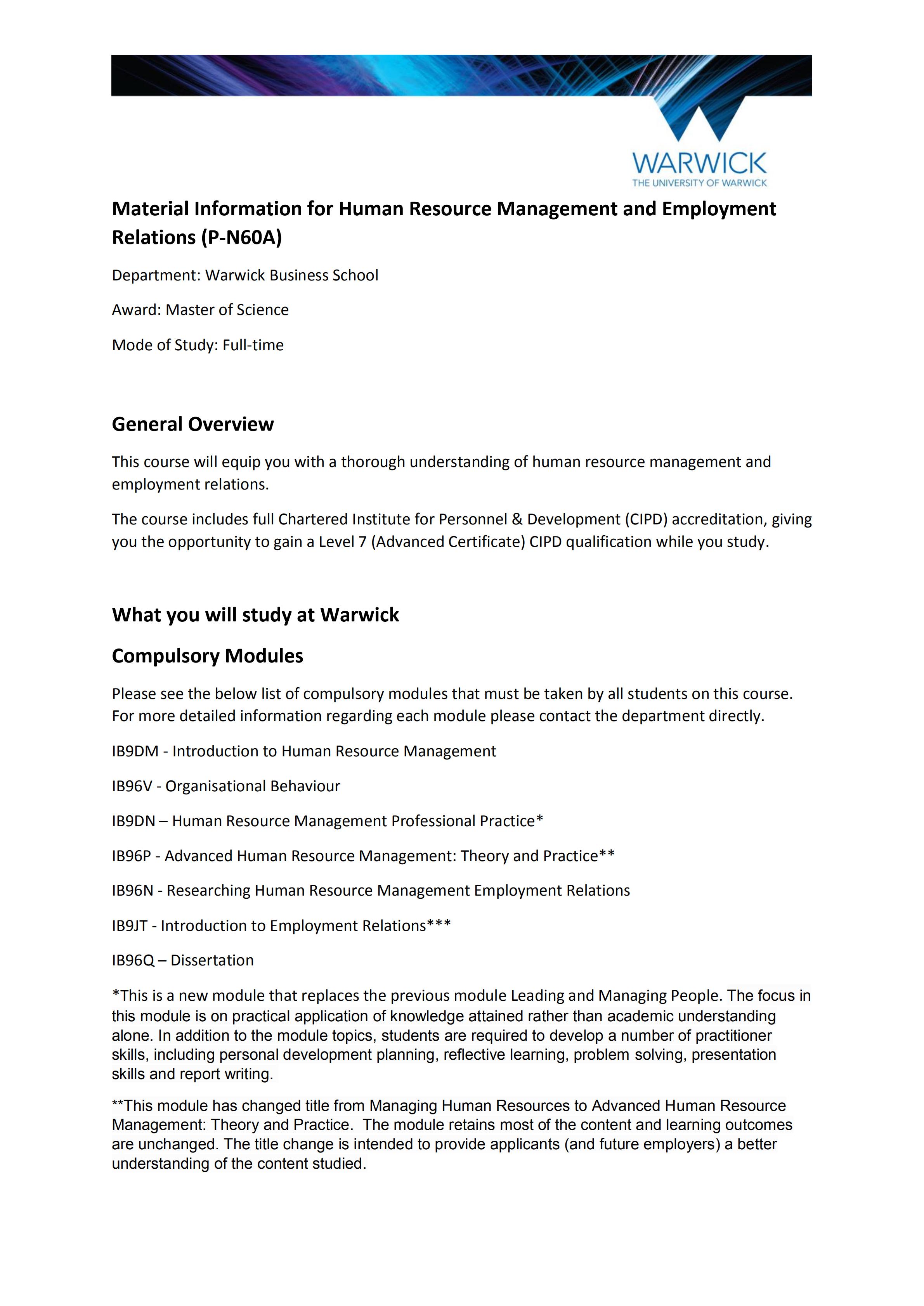 录取专业:msc human resource management