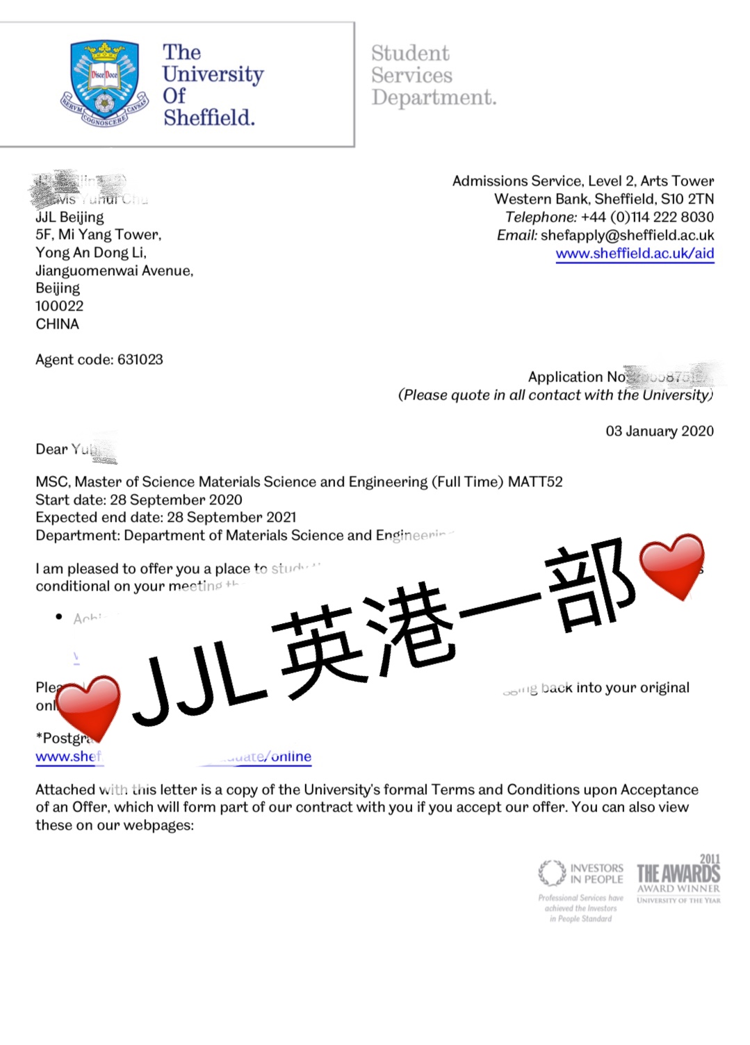 吉林建筑大学是双非院校,学校排名不高。但是学生在校期间曾参与院里导师的研究项目,取得了不俗的成绩。所以这是学生身上很大的一个优势点。于是老师决定从文书着手,用文书体现学生丰富的社会实践经历与不俗的研究能力。在学生申请材料准备齐全之后,金吉列留学运用 1+8 的服务模式,文案老师,外联老师积极为学生的申请保驾护航。最后,在学生申请一个月左右时间,学生顺利拿到了心仪的谢菲尔德大学的录取通知书!