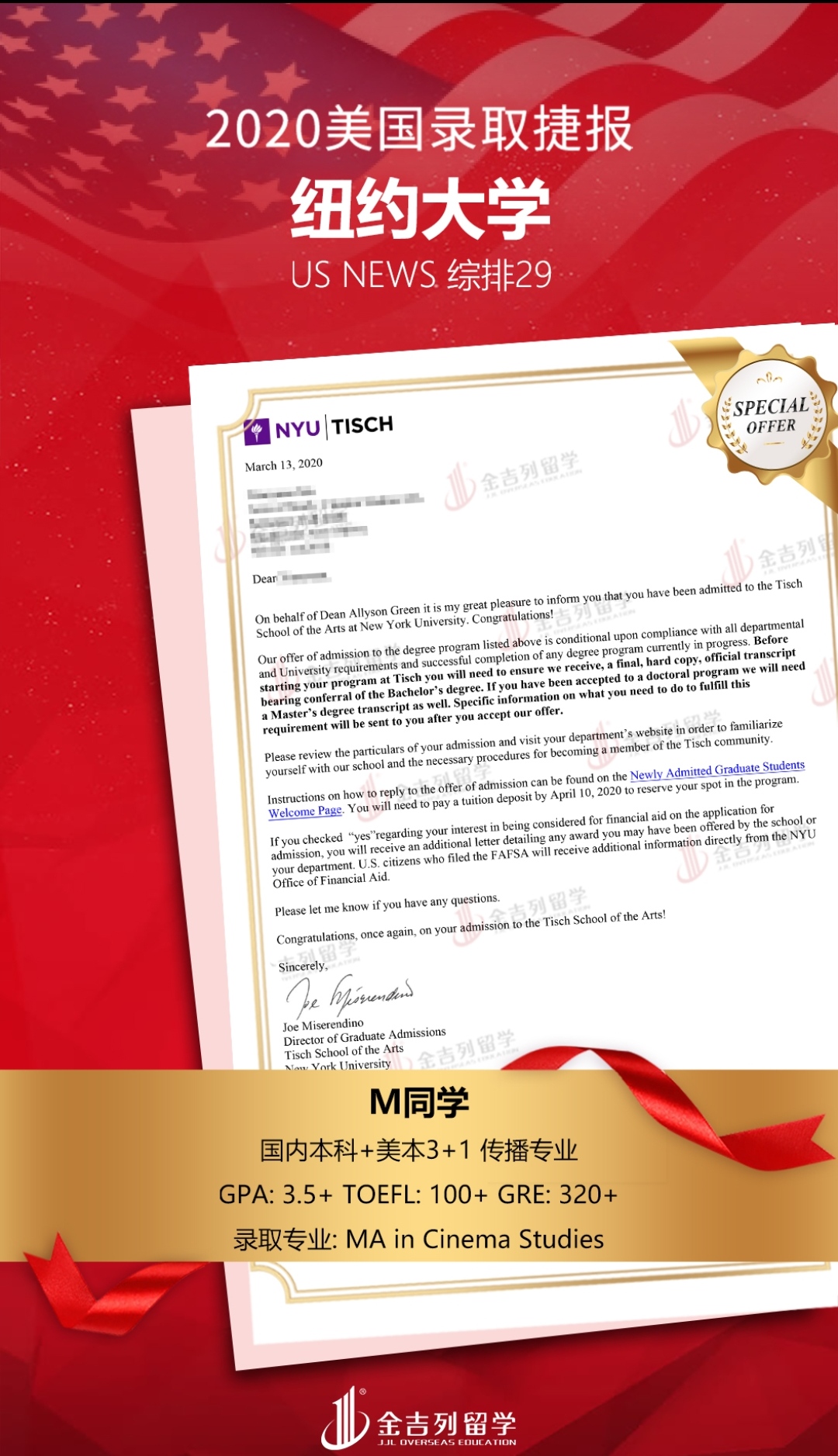 纽约大学电影学院于1965年成立。纽约大学是全美唯一一所位于纽约曼哈顿心脏地带的世界顶尖名校。Tisch学院和纽约大学的其他学院一样,坐落于纽约Downtown的华盛顿广场旁。Tisch主要分为表演艺术(Institute of Performing Arts),电影电视(Maurice Kanbar Institute of Film & Television)和新媒体(Skirball Center for New Meia)三个学部。以培养全球化的艺术人才为目标。