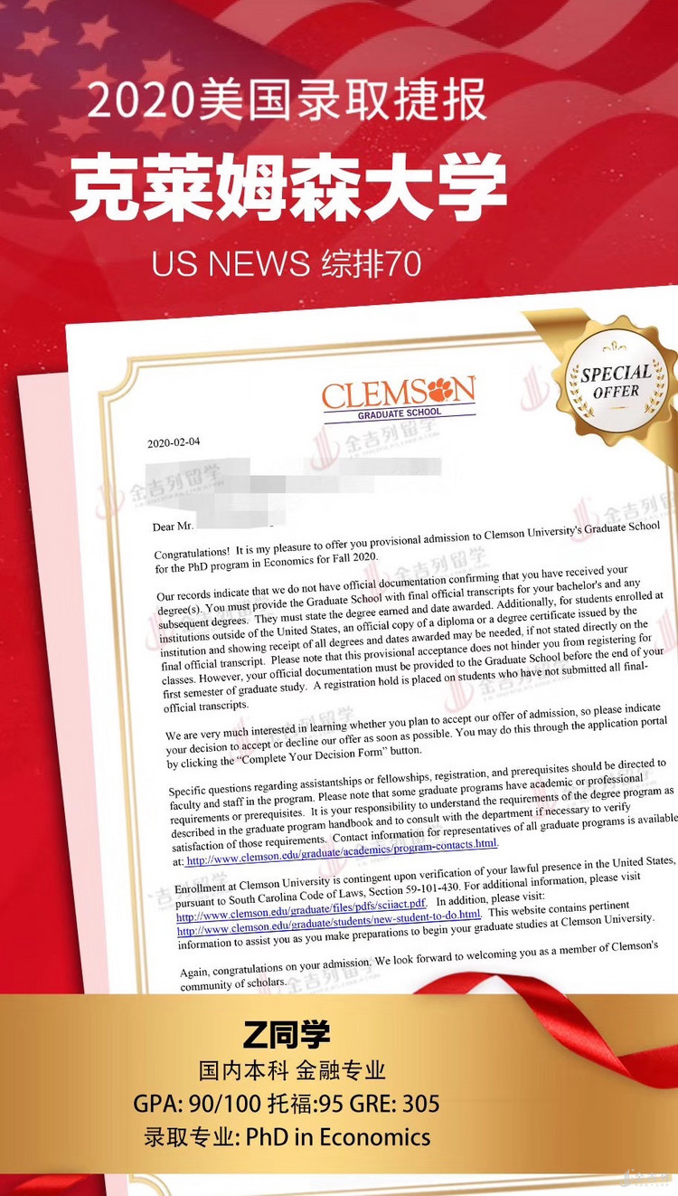 录取院校 :美国USNEWS排名第70的——克莱姆森大学