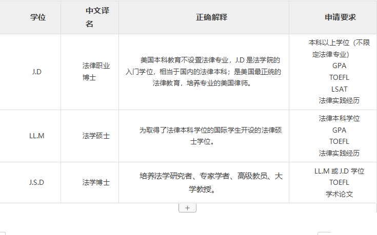 美国法学院的法律学位有三种:法律博士J.D;法学硕士LL.M和法科学博士J.S.D,具体不同学位的不同申请要求如下表所示。J.D学制3年,虽是最正统的美国法律教育途径,但是需要提供LSAT考试成绩;LL.M学制1年,无需LSAT考试,但毕业后不能考取北美律师资格(除ABA认证的LL.M考该州CA和NY)。