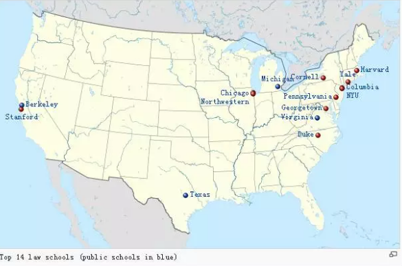 对于想要申请美国法学院的同学们而言,T14集团大家应该已经早有耳闻。在学术圈内,这14所法学院又分为三大集团,分别是“YHS”集团(Yale、Harvar、Stanfor)、“CCN”集团 (Columbia、U Chicago、NYU) 以及其他八所 (U Pen、U Michi、UVA、Duke、Cornell、UCBerkeley、Georgetown U)。以下为T14的坐标分布,由于美国的知名律所大都集中在东海岸的纽约、芝加哥和波士顿,出于未来就业工作的考虑,院校的地理位置也是同学最先考虑的一个重要参考因素。