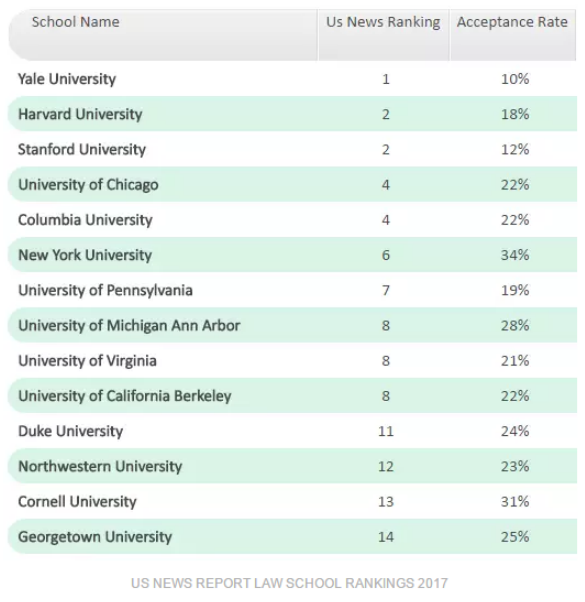 看完分布,我们再来看一下T14的录取情况,同学大都存在一个幻想,认为LL.M既然是针对国际学生专门设定的项目,那么一定很容易申请。然而现实并非如此美好,除了NYU法学院每年招生人数较多之外,其它类似耶鲁、UCLA等院校每年只招收几十名学生,T14集团的平均录取率只维持在25%左右。