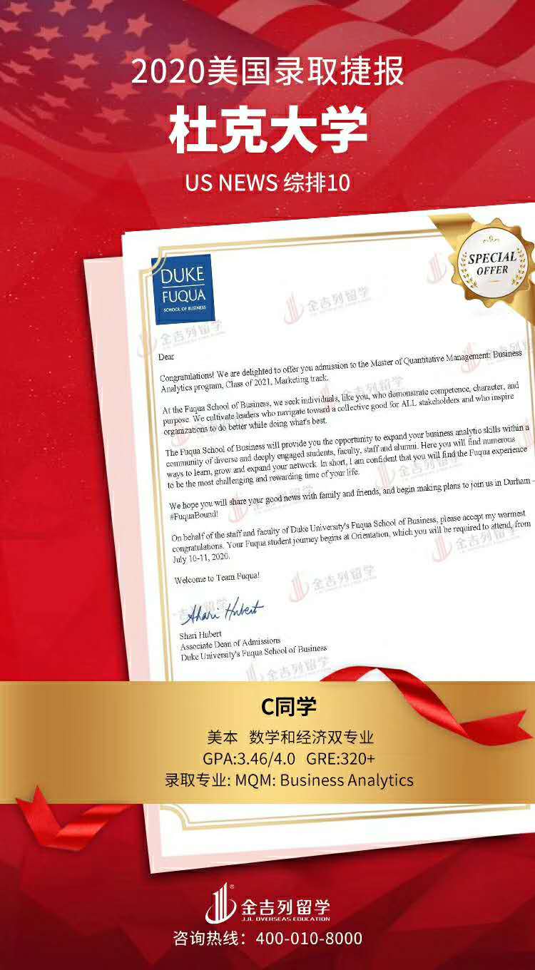 恭喜陈同学,拿到杜克大学BA录取!1月初递交,2月中未收到面试邮件,虽有失落,但继续选择等待,2月底终于峰回路转终于拿到面试邀请,3-6完成面试,北京时间3-21出结果。3-20当天沉浸在论坛里不能自已,特别是看到不少背景超牛面试后被拒的,就有点不淡定了!我和文案老师等到21号凌晨2点左右,状态更新,最终看到congratulation之后,心里的石头落地了!非常感谢陈同学及家长的信任,高端文案老师高质量的文书,期待更好的录取!