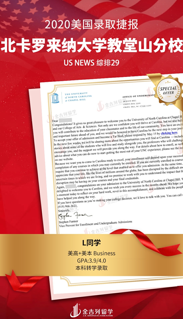 北卡罗来纳大学教堂山分校(University of North Carolina at Chapel Hill),简称UNC,创建于1789年,是世界顶级研究型大学,美国历史上第一所公立大学,也是北卡罗来纳大学系统的旗舰机构。该校是美国最顶尖的五所公立大学之一,被誉为“公立常春藤”和“新常春藤”。北卡罗来纳大学教堂山分校的医学与公共卫生领域学科享有极高的学术声誉,六位诺贝尔生理学或医学奖获得者,以及美国国立卫生研究院(NIH)现任院长Francis Collins均为该校校友。根据U.S. NEWS或者QS世界大学排名2019年评选中,Gillings公共卫生学院与哈佛公卫并列全美第2。牙医学院整体排名全美第3,Eshelman药学院排名全美第1, 医学院 - primary care 排名全美第2,医学研究排名全美第22。