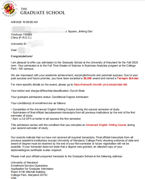 录取专业:马里兰大学商业分析硕士+5000美金奖学金