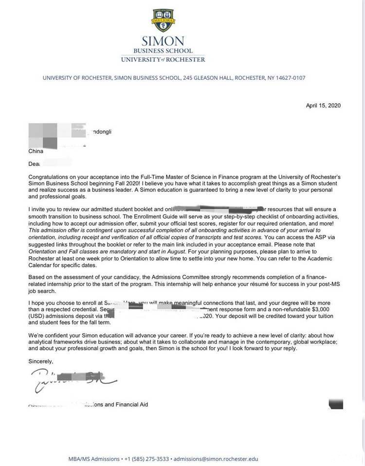 高端团队老师发掘了学生可以通过豁免GMAT申请,最终收获金融专业排名前三的罗彻斯特大学金融硕士录取