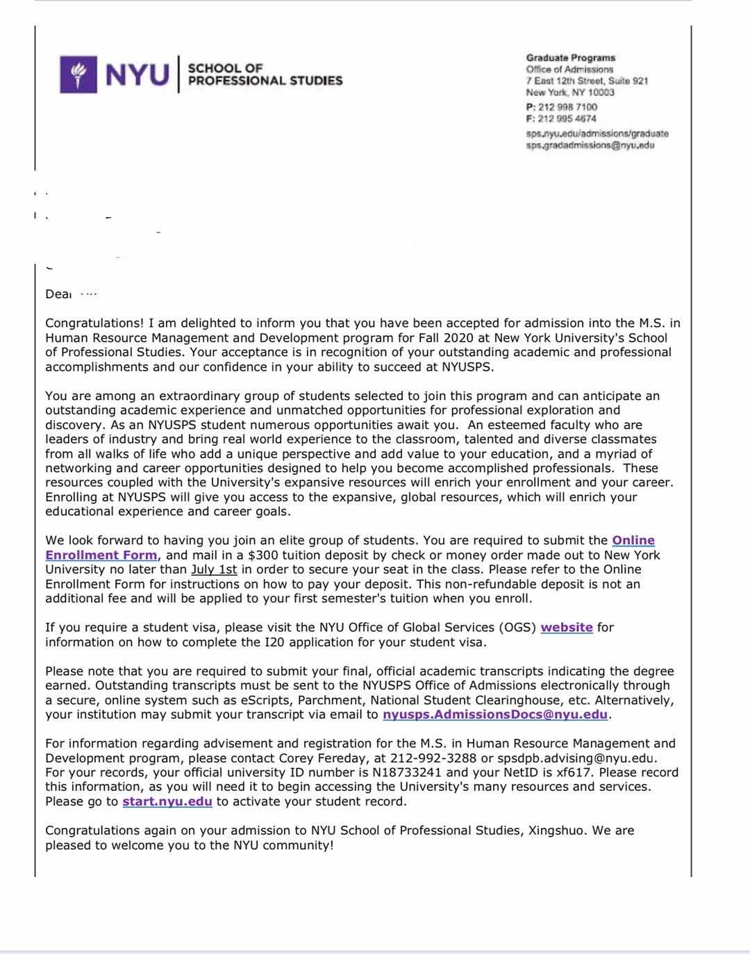 获得 offer 院校:纽约大学