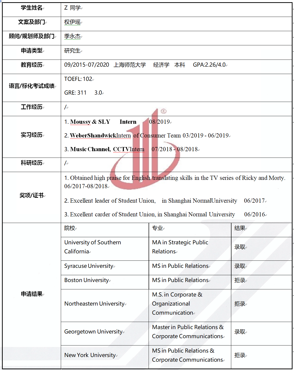 Z同学对于公共关系领域有自己独到的见解,同时申请公共关系专业不是偶尔,对于她而言是个必然的趋势,因为学生不仅有对公共关系专业探究的热情且 做了两个和公关专业相关的实习,善于从中去发现问题以及解决问题。另外,学生的口语很好,这有利于面试环节的沟通交流,善于表达自己的想法能够说清楚自己申请专业的“前因后果”