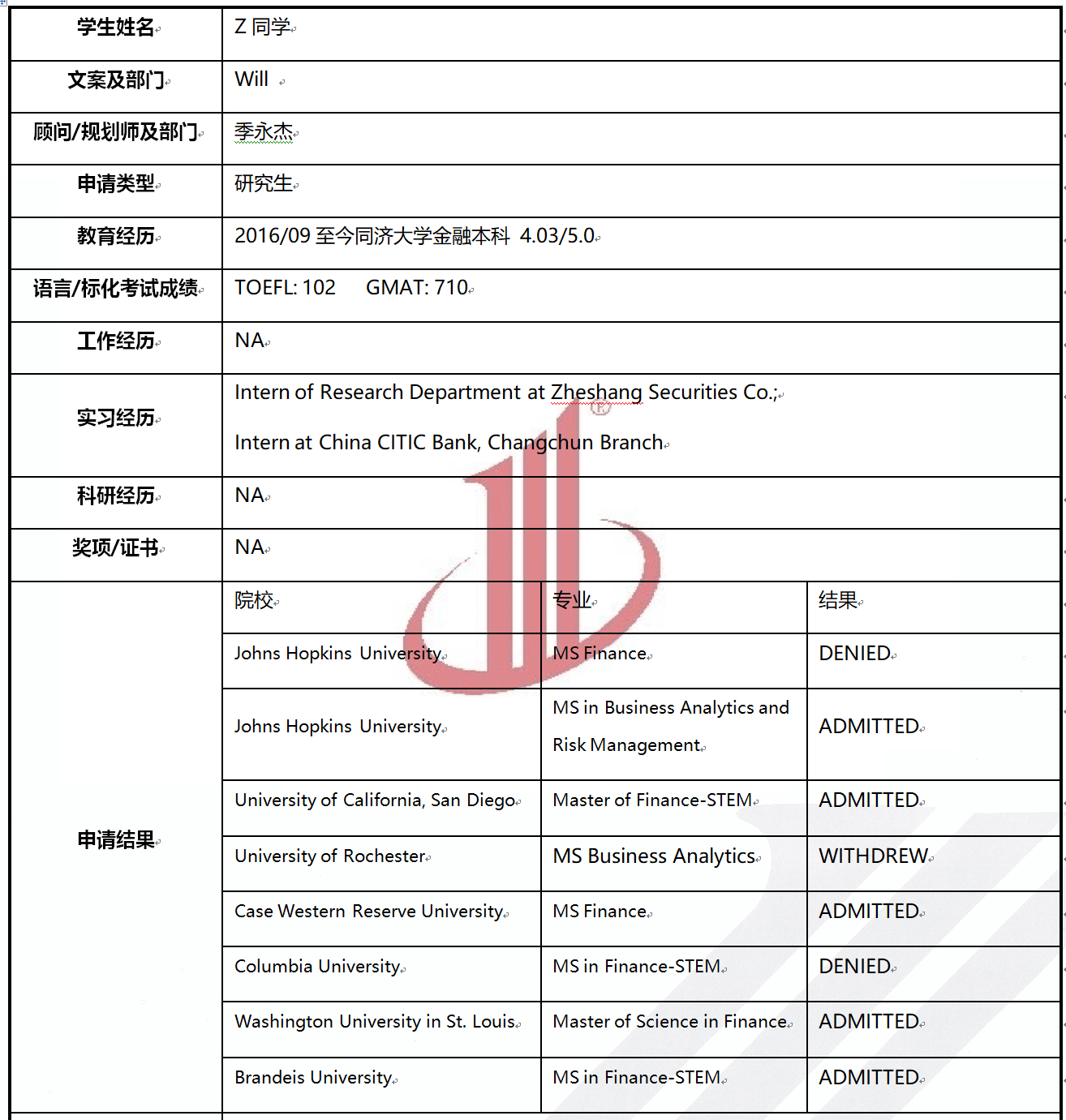 考试比较配合,托福两次就考到了102。但是GMAT有点曲折,考了4次就最高只有650。本来计划冲第一轮,最后只定了保底的凯西,以及冲刺的JHU。其他的让他再把最后一次GMAT考过之后,全冲最后一轮,结果学生还很争气,奋斗一个月后,考到了710,这个标化就很可观了,直接顺着把几个金融常申项目都定了。学生面试也比较灵,最后除了哥大SPS其他都录了,学生选择offer依然很佛系风格,一听说WUSTL的金融是美国排名第二,而且录得还是他想学的quantitative finance track,就直接交了押金决定去了。