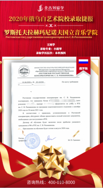 恭喜王同学获得俄罗斯罗斯托夫拉赫玛尼诺夫音乐学院 小提琴 专业本科预科录取!