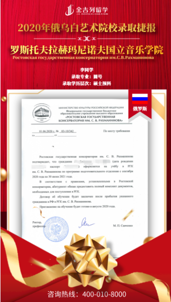 恭喜李同学获得俄罗斯罗斯托夫拉赫玛尼诺夫音乐学院 圆号 专业硕士预科录取!
