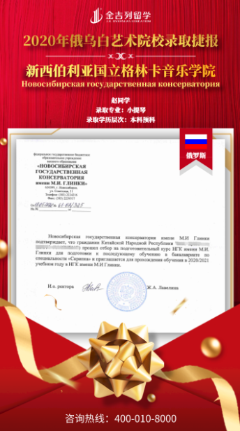 恭喜赵同学获得俄罗斯新西伯利亚格林卡音乐学院 小提琴 专业本科预科录取!
