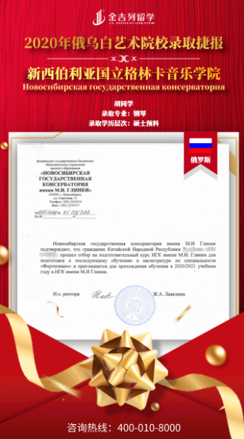 恭喜胡同学获得俄罗斯新西伯利亚格林卡音乐学院