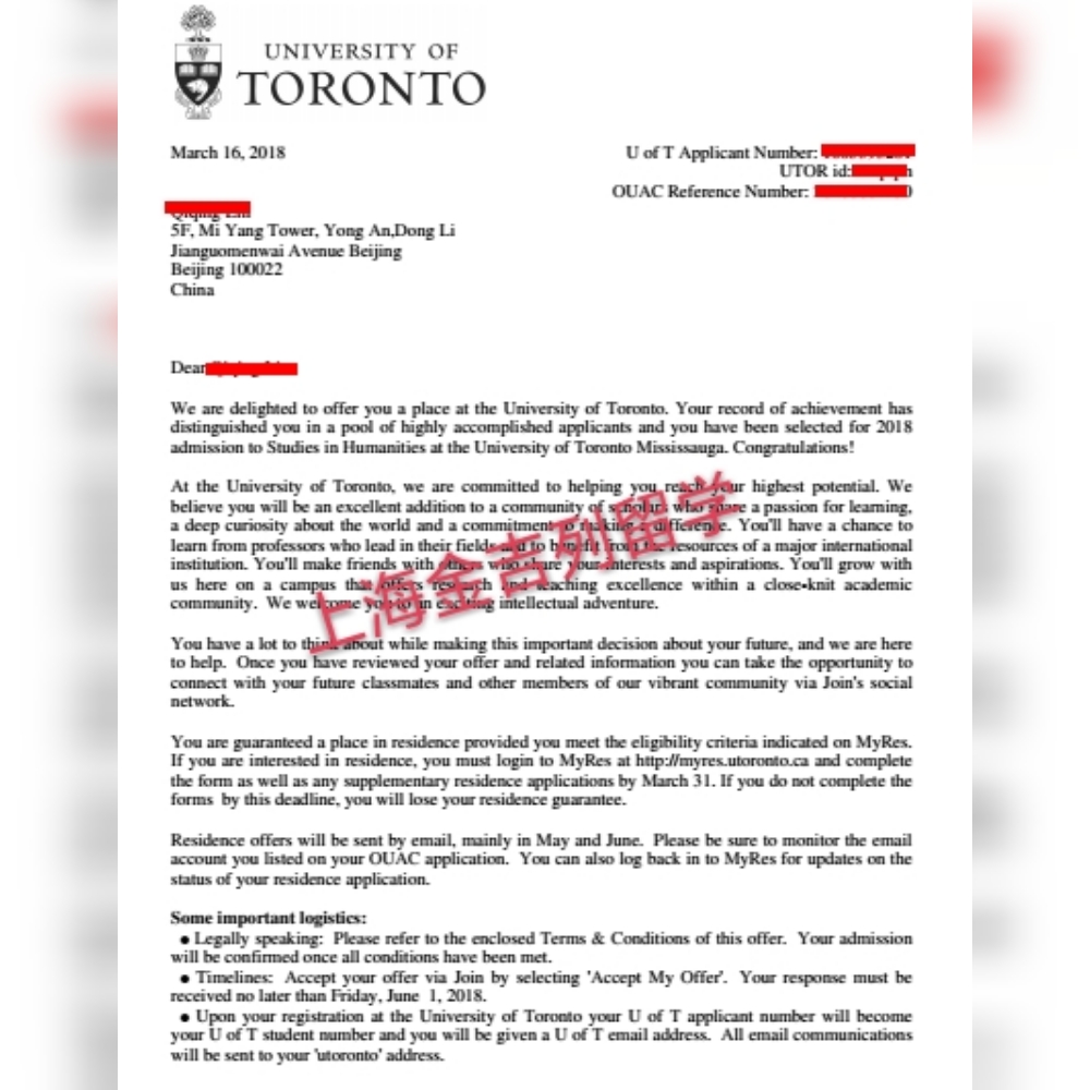 国际学校,均分81,雅思6分,申请到多伦多大学分校区的人文研究专业