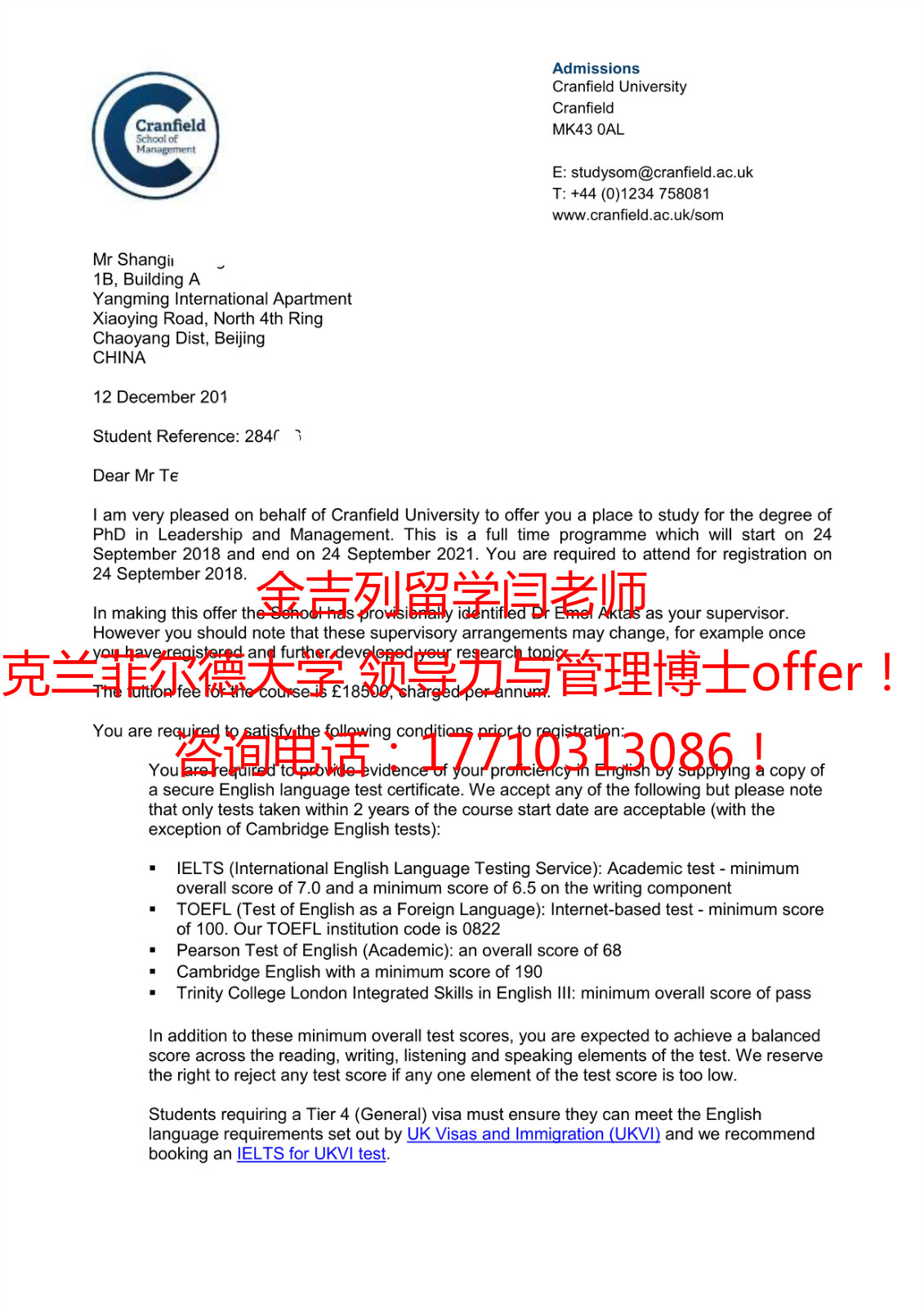 录取结果:克兰菲尔德大学