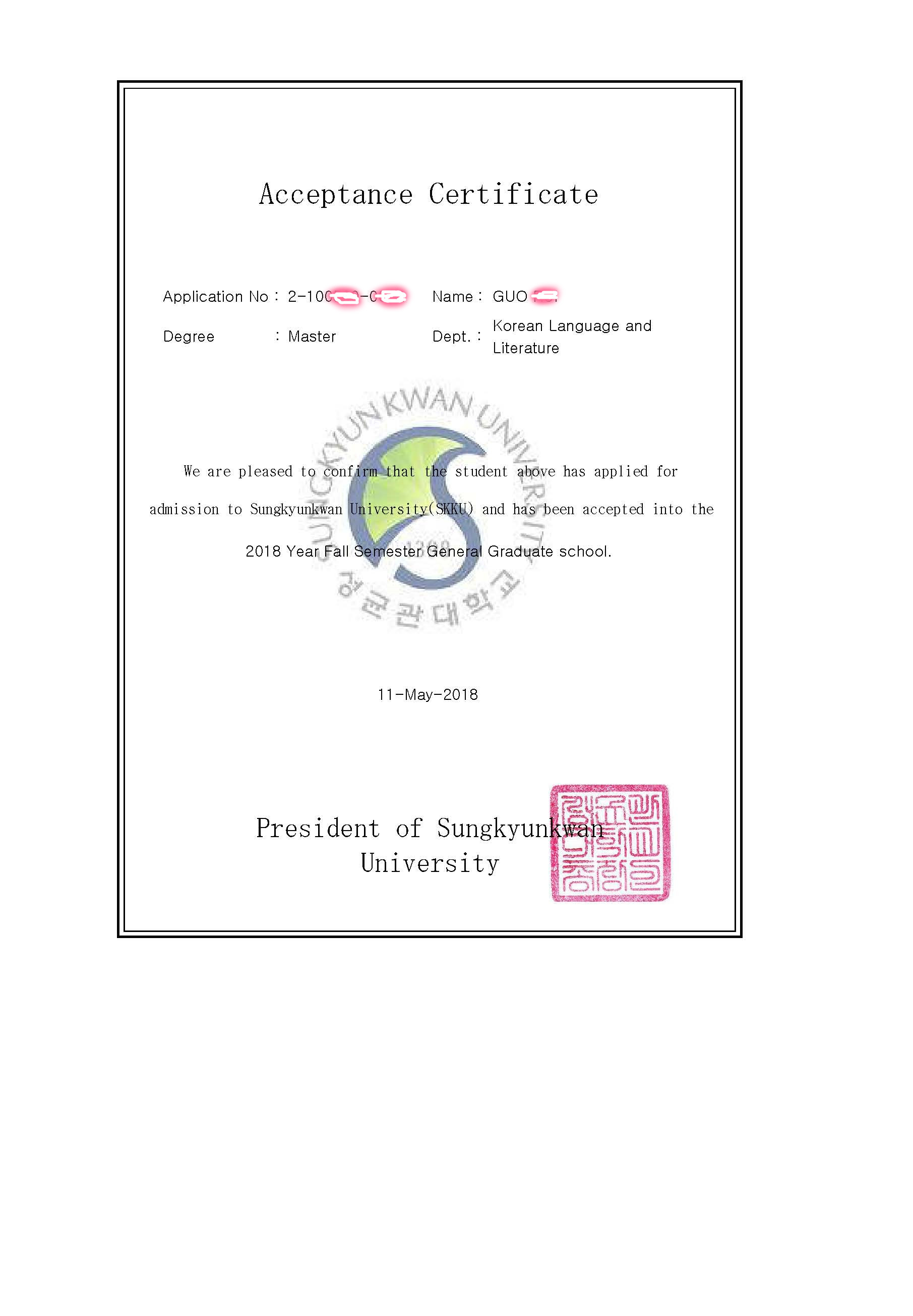 > 恭喜郭同学 成均馆研究生录取