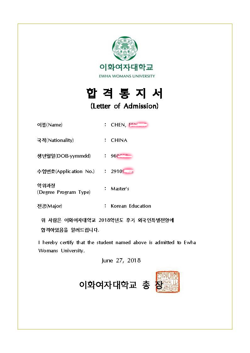 > 恭喜CHEN同学 梨花女子大学研究生录取